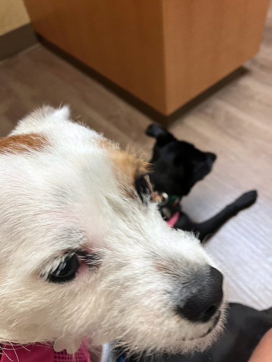 Still, home we went from our vet’s, with me now hopeful. That night, after I gave Mal her first dose of newly prescribed meds, she was still, of course, scratching and licking and biting her skin, just visibly unhappy. Marley sat by her and whined pitifully for her sadly decommissioned play companion.