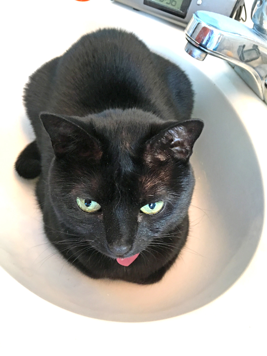 Which is to say that I remain there, in the state one reasonably might when just out of the shower, feeling utterly ridiculous, as my beloved kitten-sized old darling, the undisputed queen of our house, slowly, deliberately licks the smear of oil from my foot.