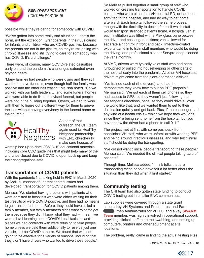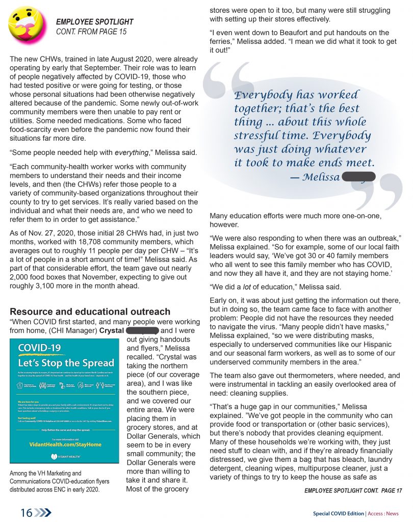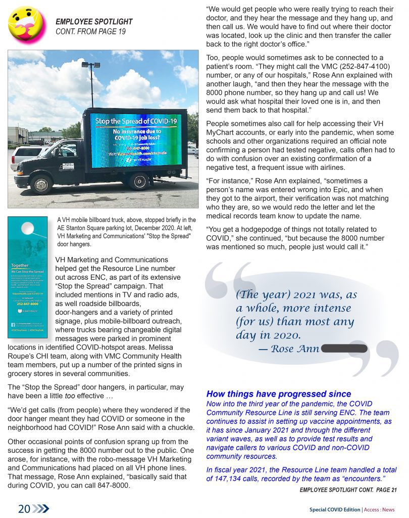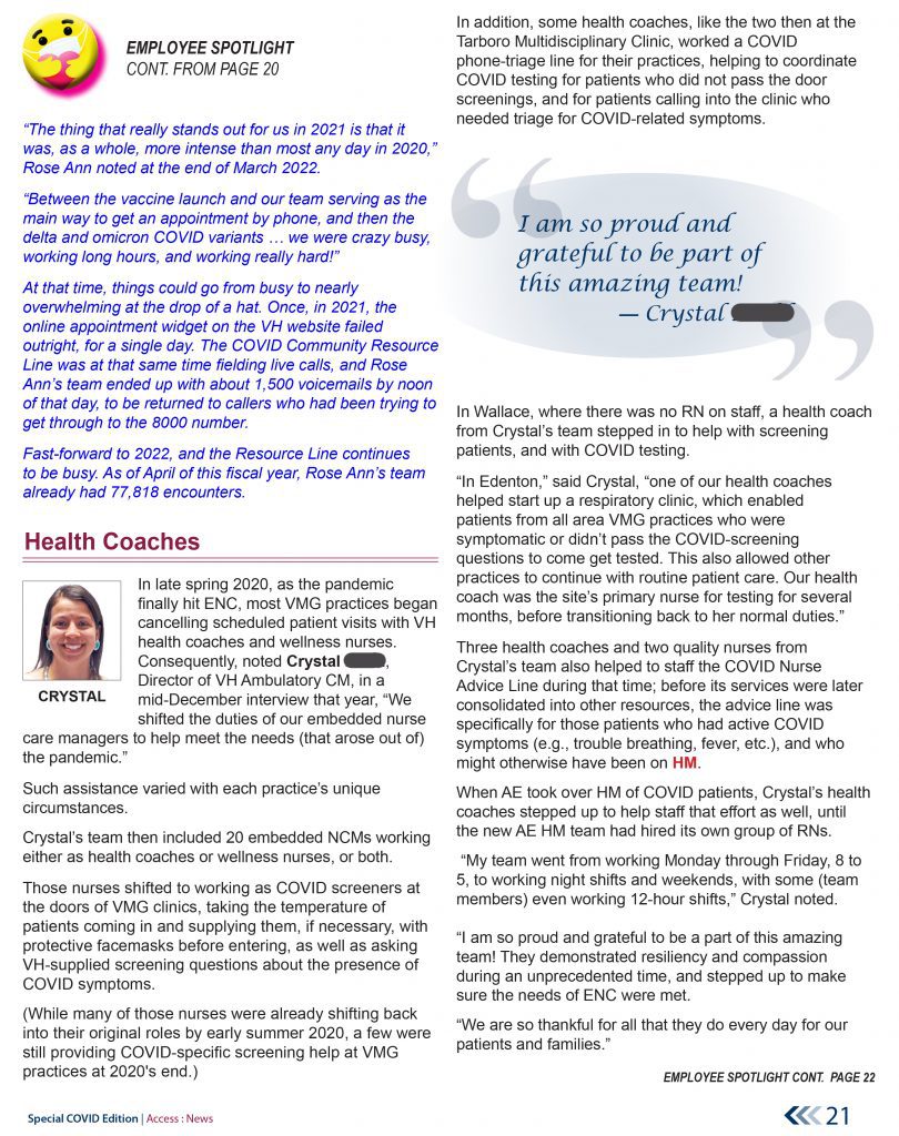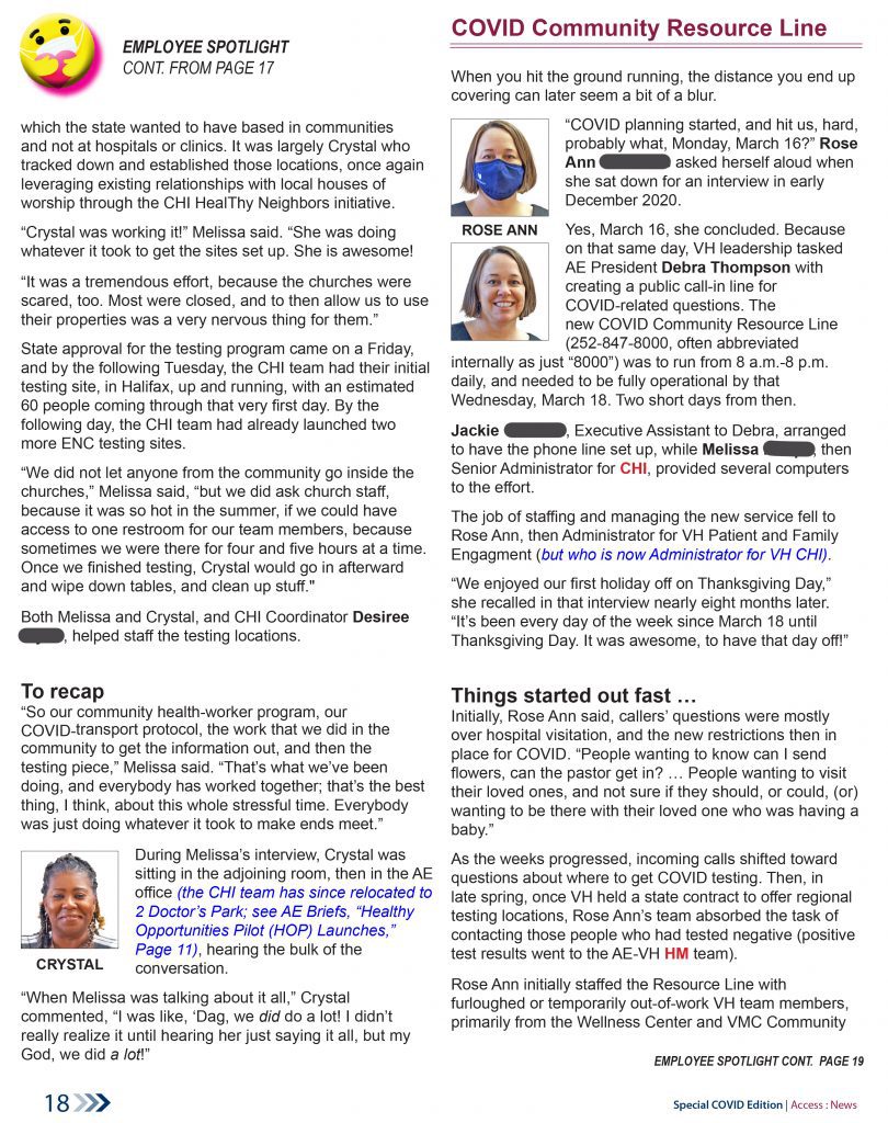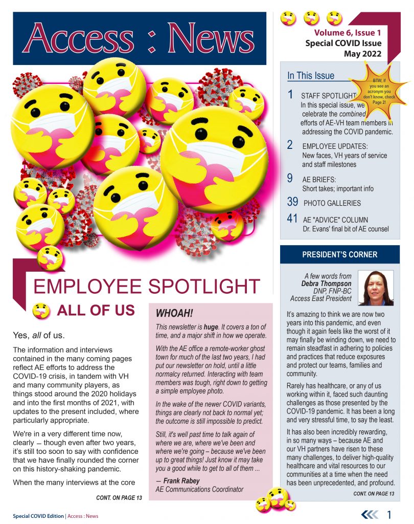 These samples are from the early summer 2022 41-page special edition of the Access East newsletter, which covered the more than two years of upheaval, and health-care innovation, arising out of the COVID pandemic. Our teams were tasked by Vidant Health (now ECU Health) to lead the health system’s community efforts to address this historic health crisis.