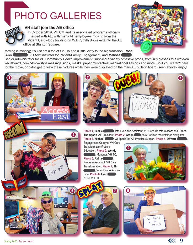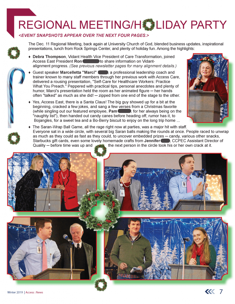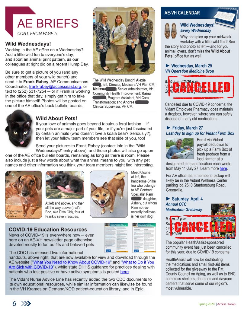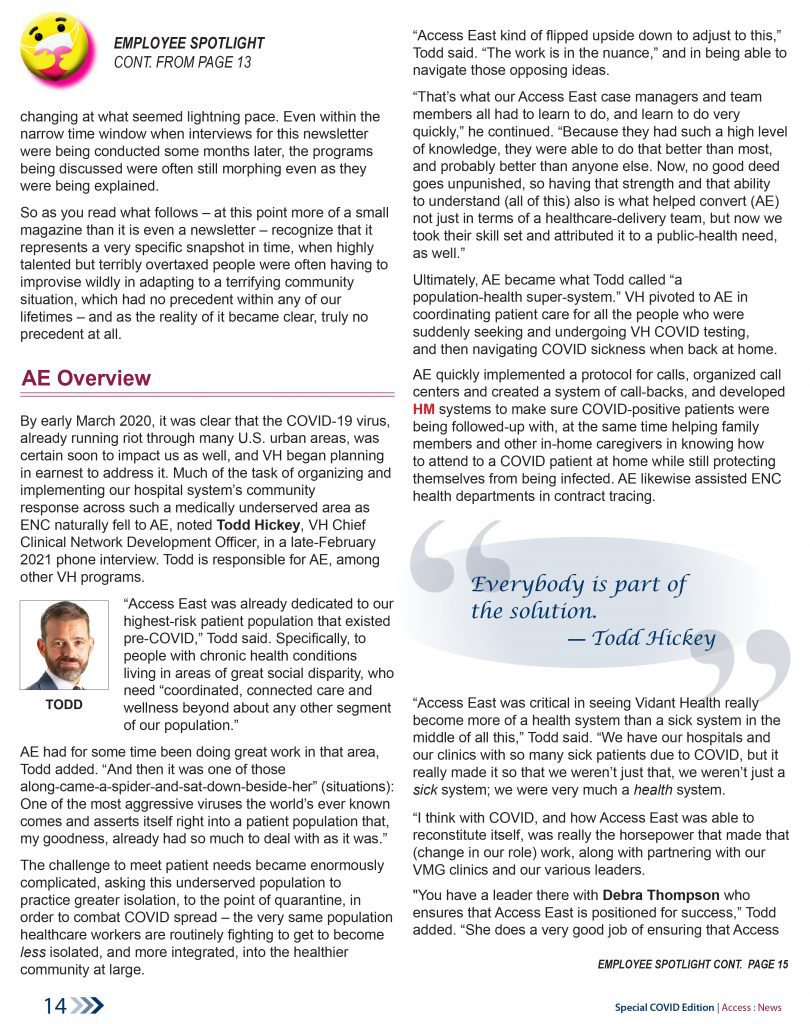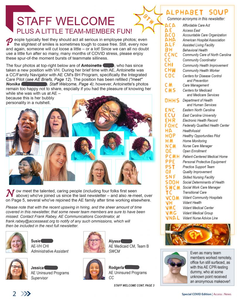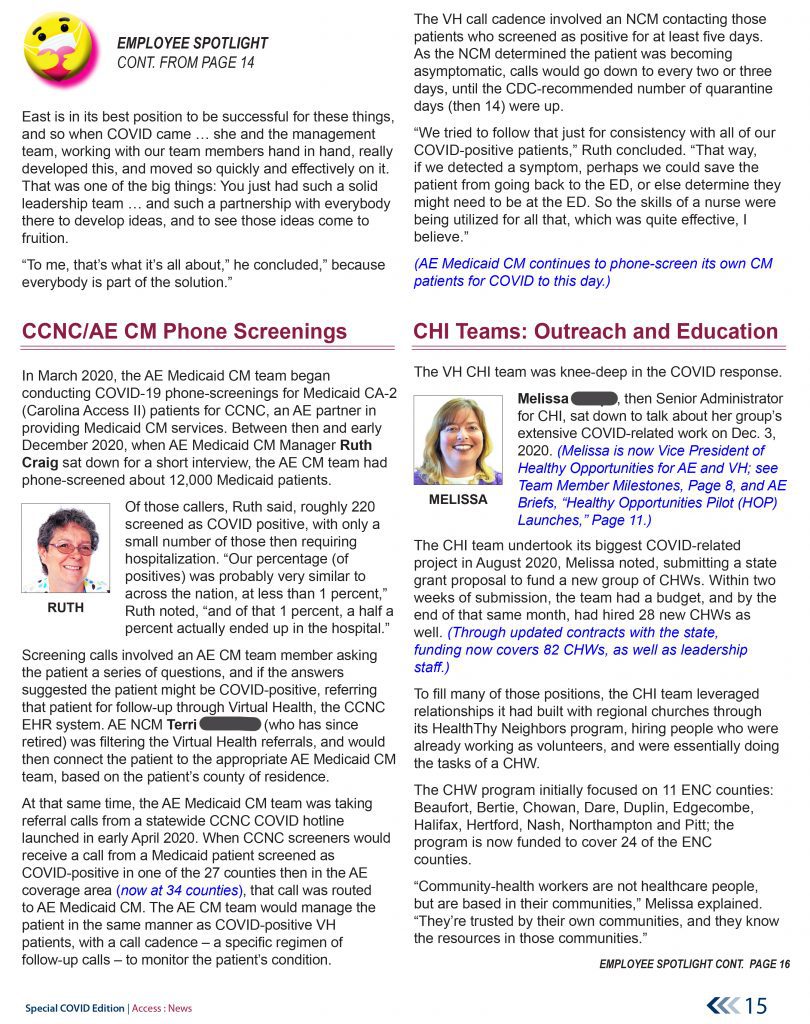 These samples are from the early summer 2022 41-page special edition of the Access East newsletter, which covered the more than two years of upheaval, and health-care innovation, arising out of the COVID pandemic. Our teams were tasked by Vidant Health (now ECU Health) to lead the health system’s community efforts to address this historic health crisis.
