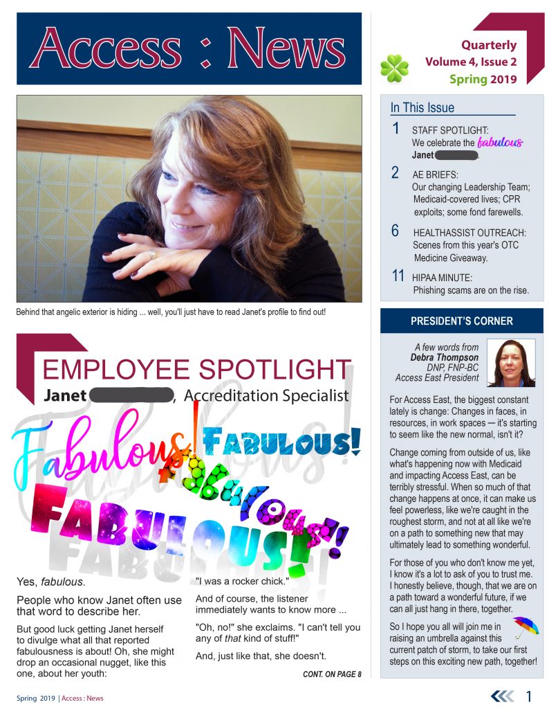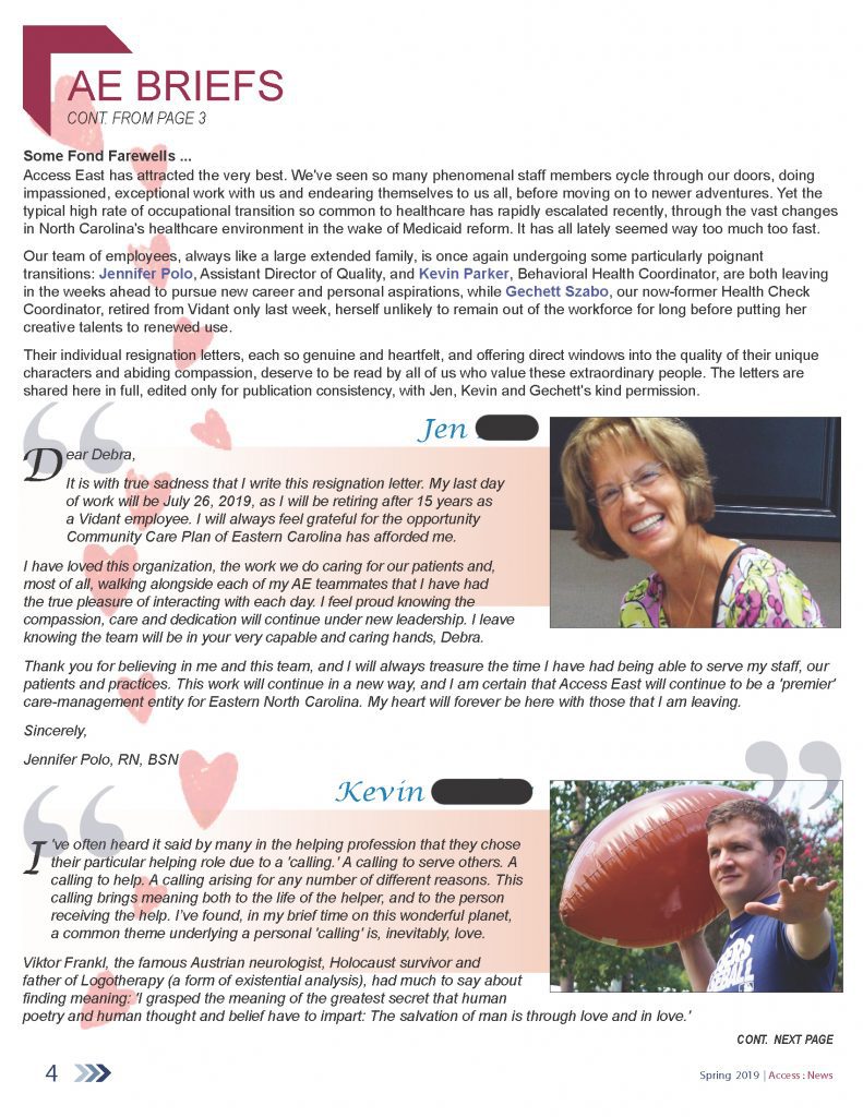 I initiated the Access East newsletter as a quarterly email release in 2016, putting it on indefinite hold after the spring 2020 issue, in the face of massive workplace changes arising from the COVID pandemic, and the subsequent lack of in-person staff interactions or my own limited safe access to many employees who were working remotely across eastern North Carolina. The newsletter has since returned as a very intermittent undertaking, as company news dictates.